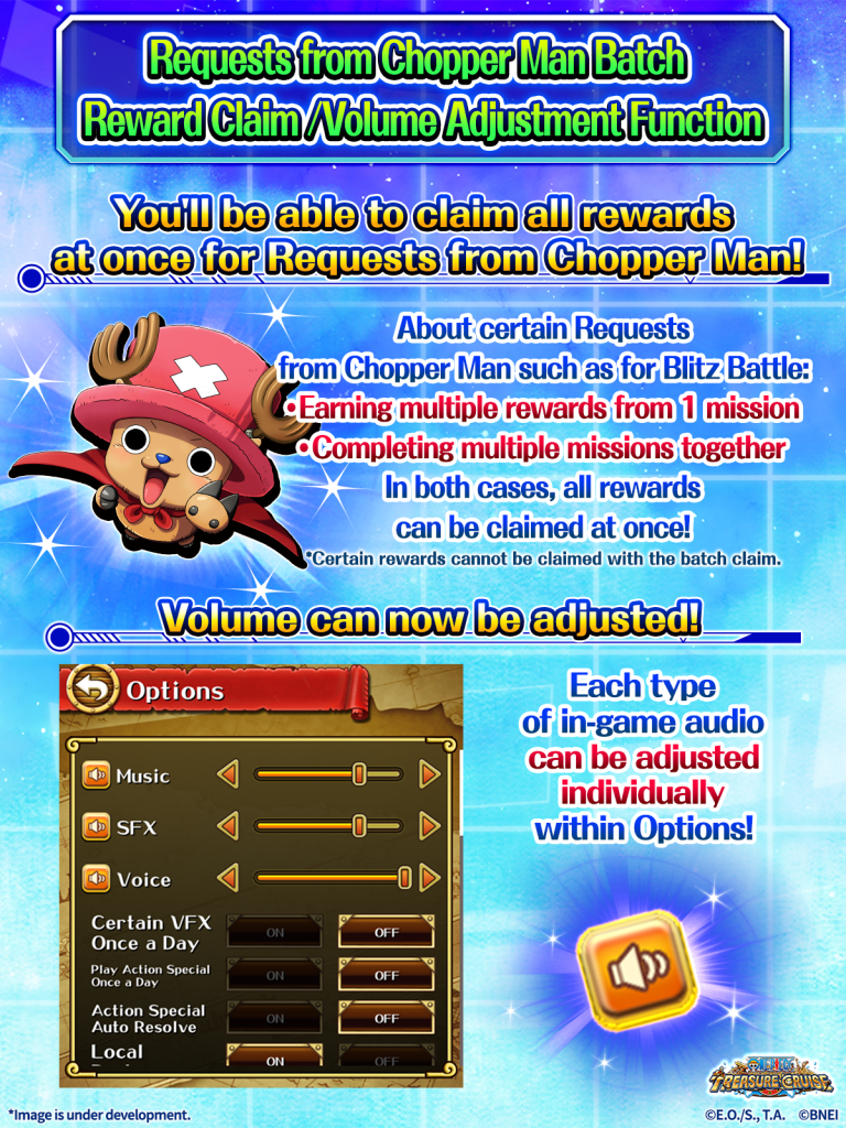 You will be able to claim rewards for certain Requests from Chopper Man, such as for Blitz Battles, all at once!