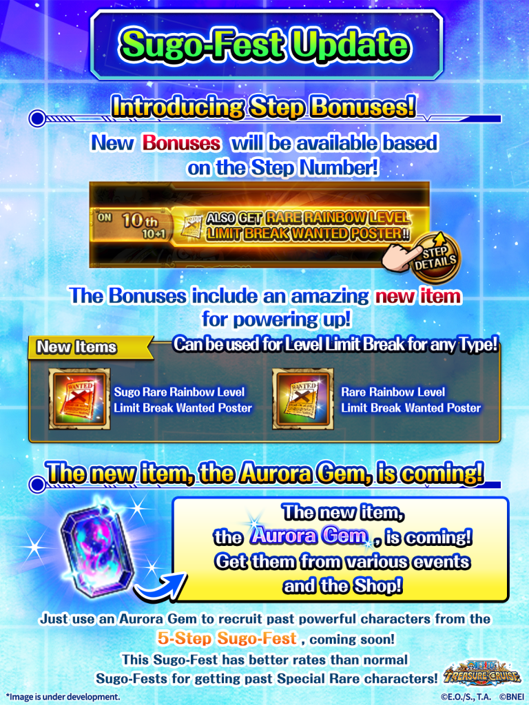 This item is required to recruit from the upcoming special 5-Step Sugo-Fest, where powerful characters from the past appear at a higher rate than regular Sugo-Fests. Aurora Gems can be obtained through various events and the Shop.Please check the in-game notice during the 5-Step Sugo-Fest for more details.