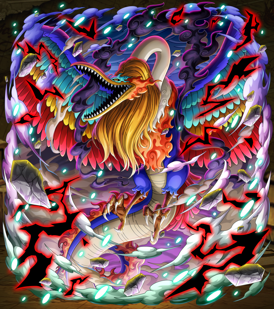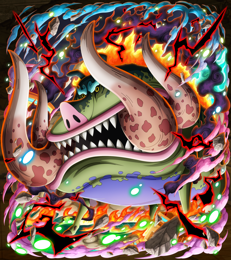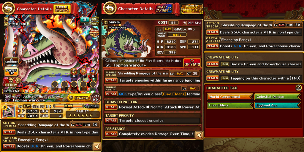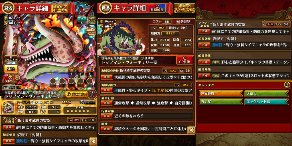・一味に[五老星][天竜人][海軍]が合計5人以上いる時かつ一味に全属性がいる時、敵にかかっているダメージ上限固定効果の1.3倍まで上限を無視してダメージを与えることができるようになる船長効果を持つ!