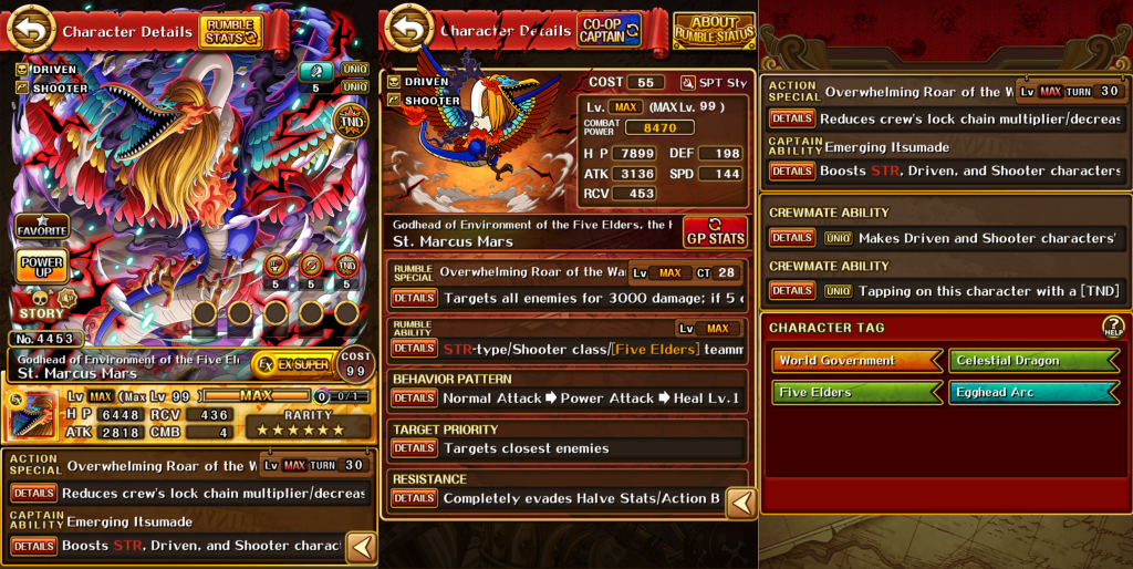 – If this character is a Captain (Friend/Helper Captain does not count) and performs EXCELLENT for the Action Special, for 3 turns, “Boosts [Five Elders], [Celestial Dragon], and [Navy] characters’ ATK by 1.1x” becomes “Boosts [Five Elders], [Celestial Dragon], and [Navy] characters’ ATK by 1.3x”