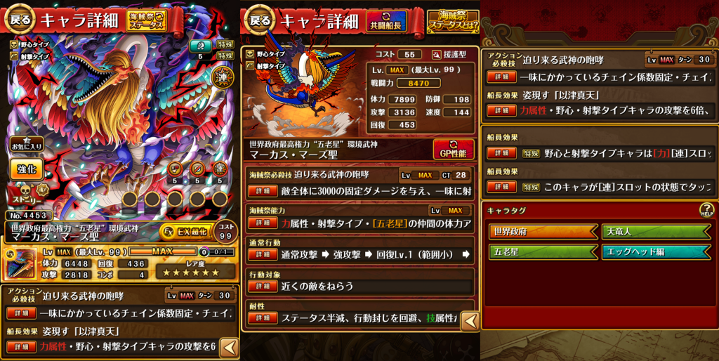 ・自分が船長でアクション必殺技の判定がEXCELLENTの時(フレンド船長・助っ人船長は不可)、3ターンの間「[五老星][天竜人][海軍]の攻撃を1.1倍にする」が「[五老星][天竜人][海軍]の攻撃を1.3倍にする」になる!