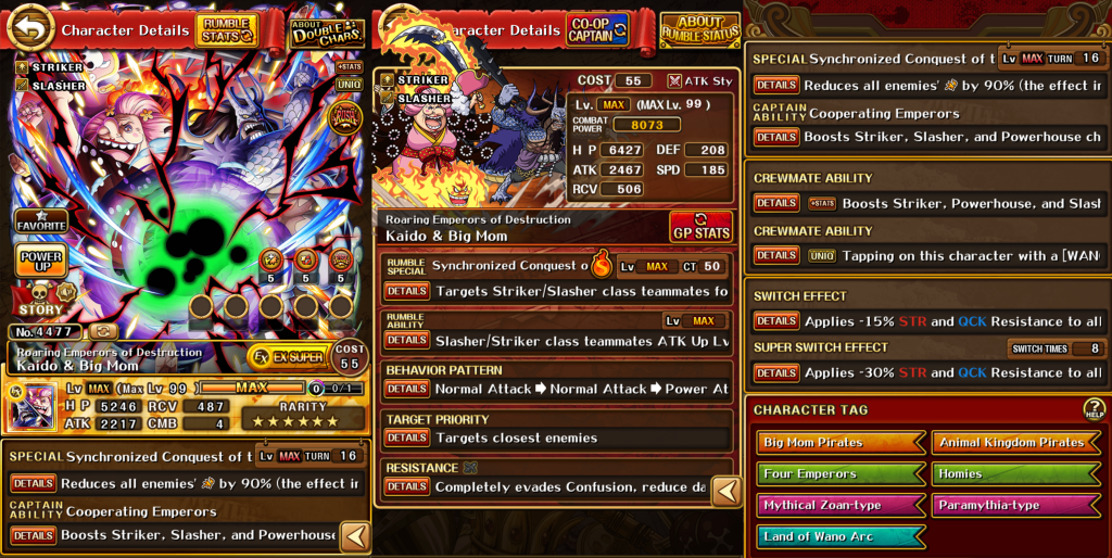 -They have a Captain Ability where if 5 or more [Animal Kingdom Pirates], [Big Mom Pirates], [Land of Wano Arc], and/or [Mythical Zoan-type] are on the crew, when a Special with a slot modifier effect is activated by the crew, boosts Striker / Slasher / Powerhouse characters’ advantageous class effect by 1.75x for 1 turn regardless of the effective turns of the converted effect!
