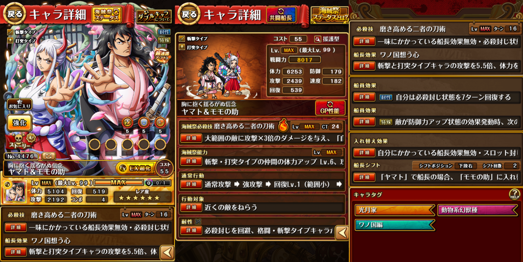 ・発動条件:「ヤマト&モモの助」になり、一味に以下のキャラの誰かから2人以上いる時(サポートキャラを除き、自分が船員でも発動可能)※ダブルキャラは1人とカウントする