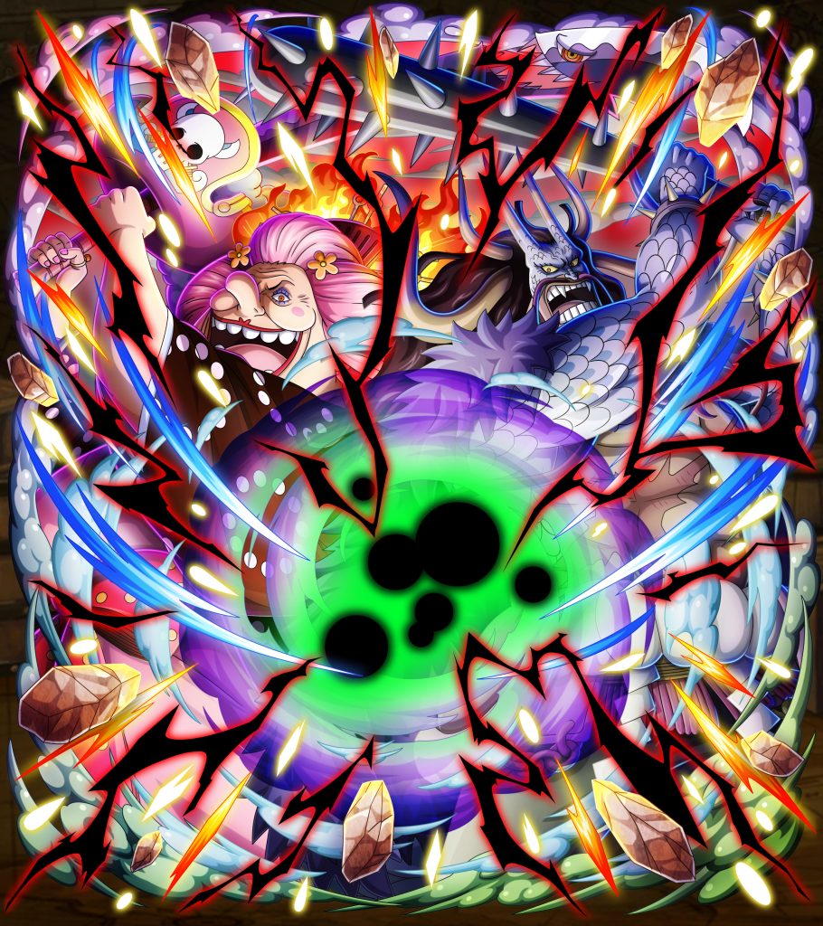 ・一味に[百獣海賊団][ビッグ・マム海賊団][ワノ国編][動物系幻獣種]が合計5人以上いる時、一味がスロット倍率変更の必殺効果を発動した場合、該当効果のターンにかかわらず、1ターンの間打突・斬撃・強靭タイプキャラの弱点タイプへの影響を1.75倍にする効果に変更される船長効果を持つ!