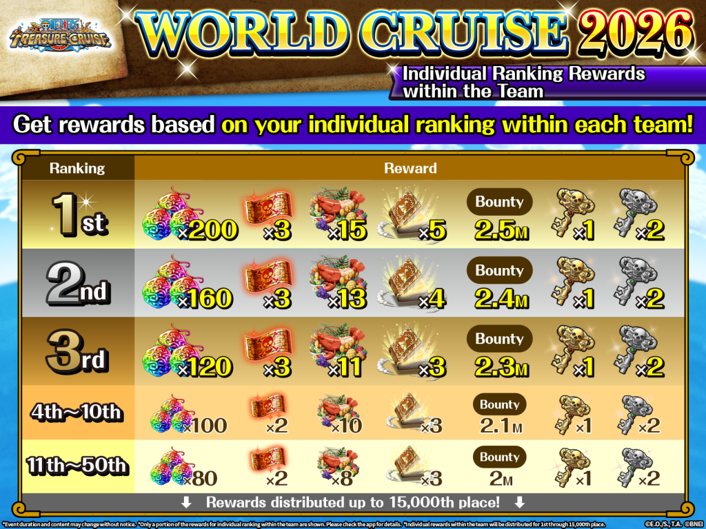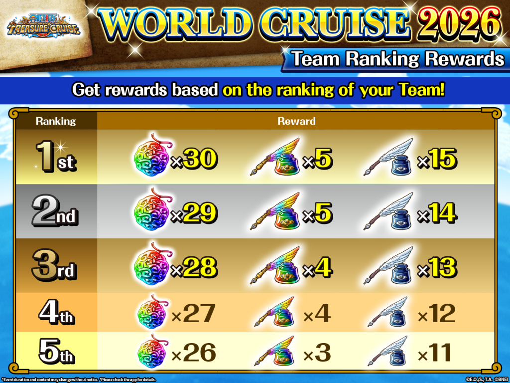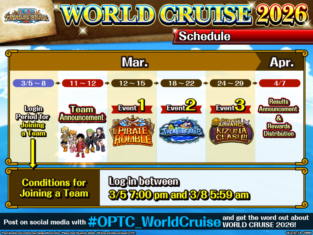 In this event, players will split up into 5 teams: Team Luffy, Team Zoro, Team Nami, Team Sanji, and Team Robin. Every team will be competing for the rankings in the following 3 events held during the period: Pirate Rumble, Treasure Map, and Kizuna Clash.