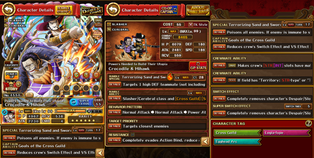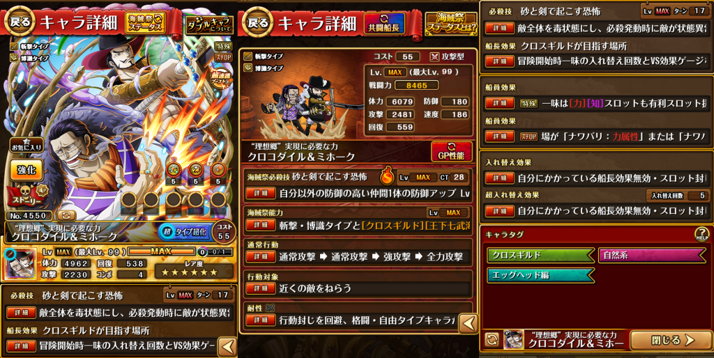 ・必殺発動時場が「ナワバリ:力属性」、「ナワバリ:知属性」、「ナワバリ:斬撃タイプ」のいずれかの時かつ一味に[クロスギルド][四皇]が合計2人以上いる時、1ターンの間2種類のダメージ量上昇状態を同時に使用できるようになり(同様の種類がある場合重複できない)、その後、3ターンの間「クロコダイル&ミホーク」になる!