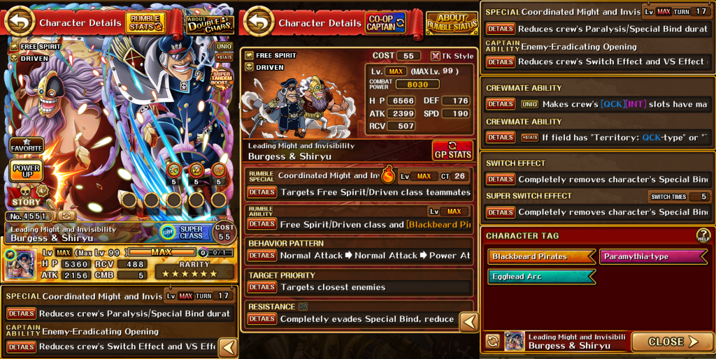 – When 2 or more [Blackbeard Pirates] and/or [Four Emperors] characters are on the crew, boosts Free Spirit / Driven / Slasher class characters’ ATK by 1.1x