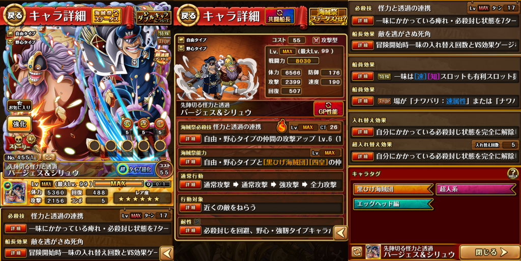 ・必殺発動時場が「ナワバリ:速属性」、「ナワバリ:知属性」、「ナワバリ:自由タイプ」のいずれかの時かつ一味に[黒ひげ海賊団][四皇]が合計2人以上いる時、3ターンの間速と知属性の通常攻撃のチェイン係数増加量が最大で+0.7になる!(Good+0.3、Great+0.5、Perfect+0.7になる)